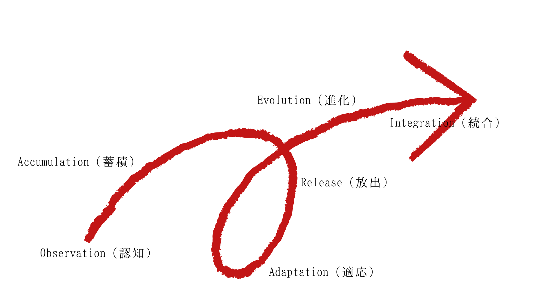 やがて質的転換が起こり(進化)、得た知恵を社会へ返す(統合)。